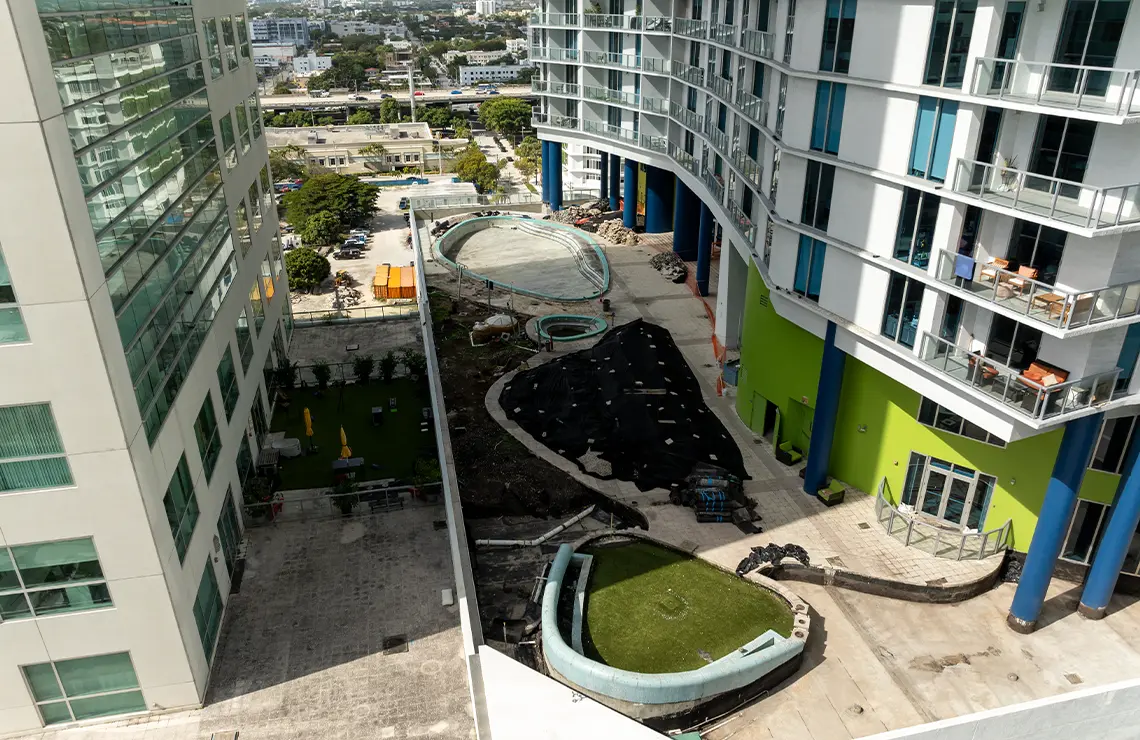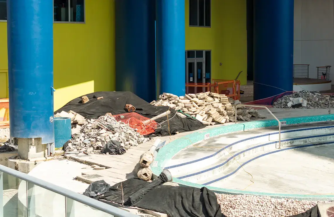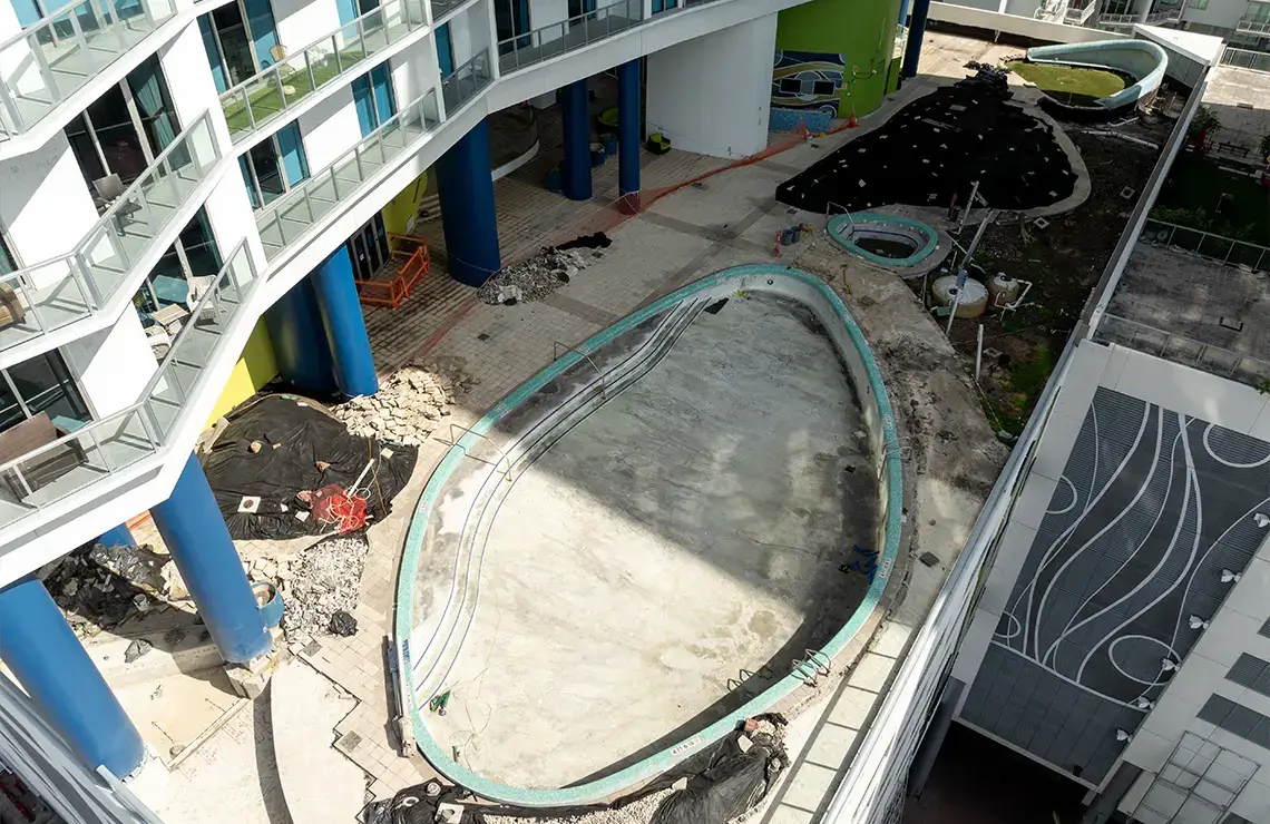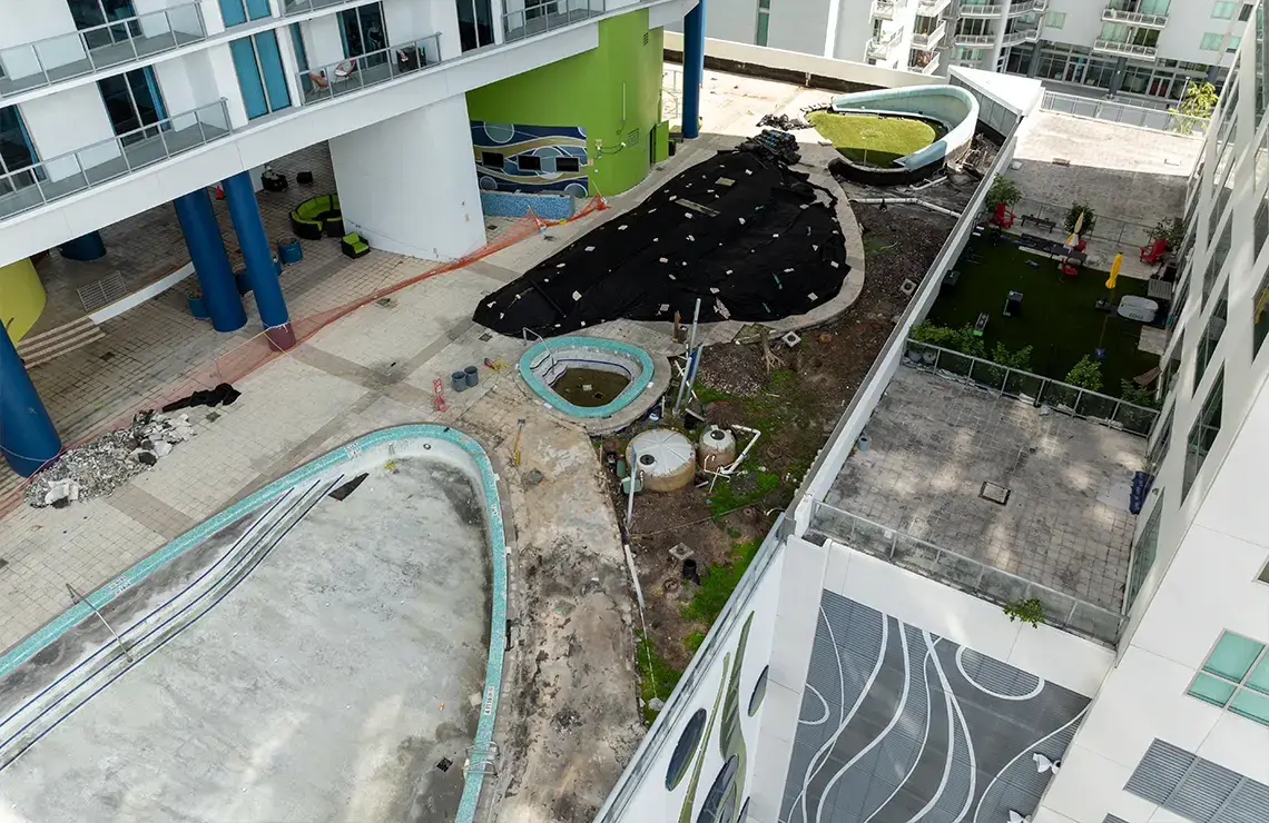 The comprehensive repair and renovation project includes the complete repair and renovation of the pool deck area. This project consists of extensive demolition work to remove damaged surfaces, and outdated materials. Waterproofing measures are applied throughout the affected areas, along with the refurbishment of the drainage systems to prevent water intrusion and ensure long-term surface protection. The entire pool deck is being fully repaired, resurfaced, and upgraded with new pavers for improved aesthetics, safety, and functionality. Additionally, a new yoga turf area will be installed to create a designated recreational space.