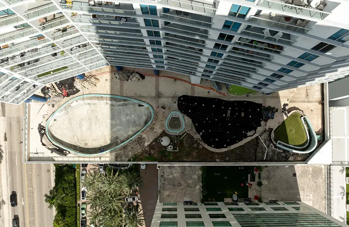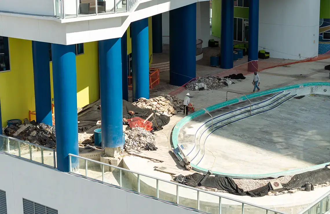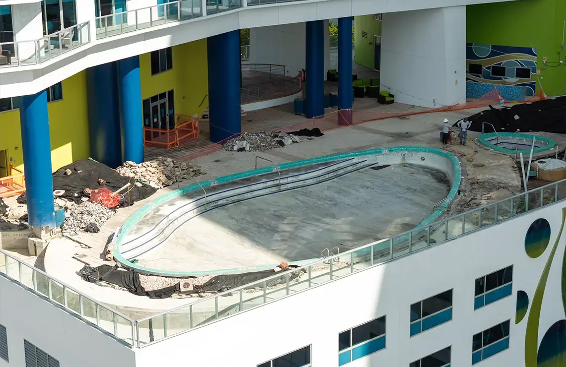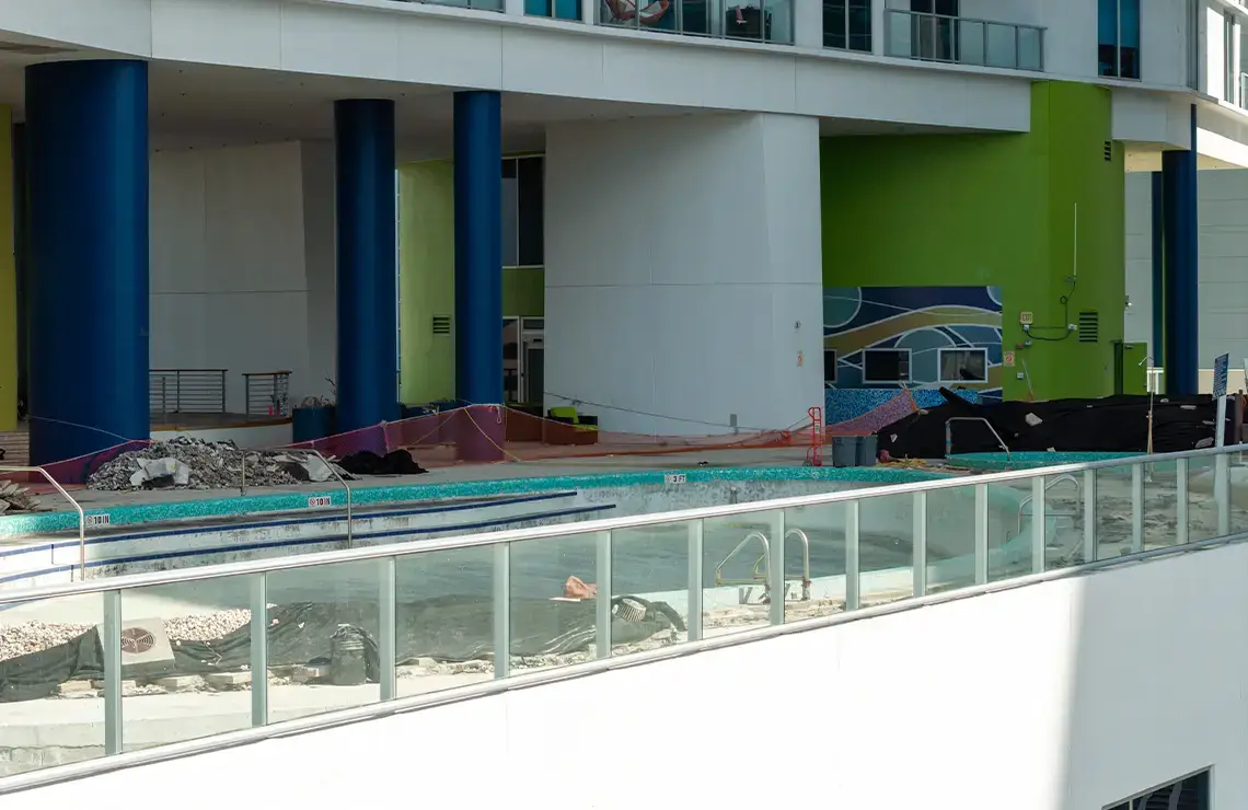 The comprehensive repair and renovation project includes the complete repair and renovation of the pool deck area. This project consists of extensive demolition work to remove damaged surfaces, and outdated materials. Waterproofing measures are applied throughout the affected areas, along with the refurbishment of the drainage systems to prevent water intrusion and ensure long-term surface protection. The entire pool deck is being fully repaired, resurfaced, and upgraded with new pavers for improved aesthetics, safety, and functionality. Additionally, a new yoga turf area will be installed to create a designated recreational space.
