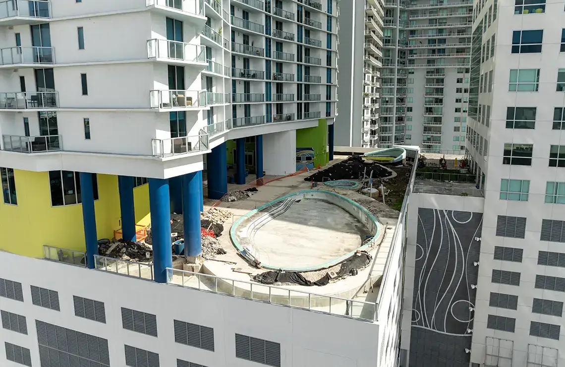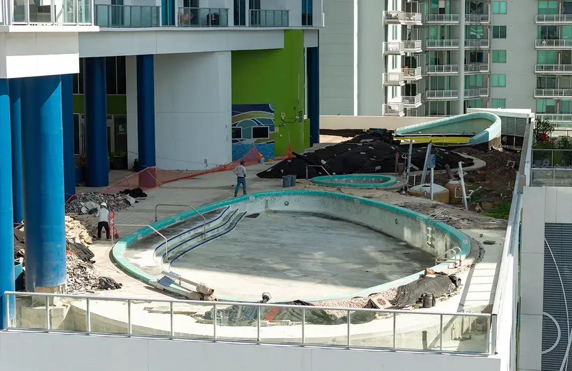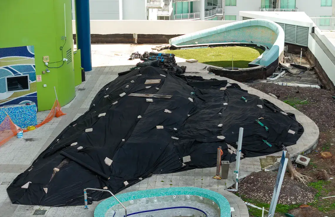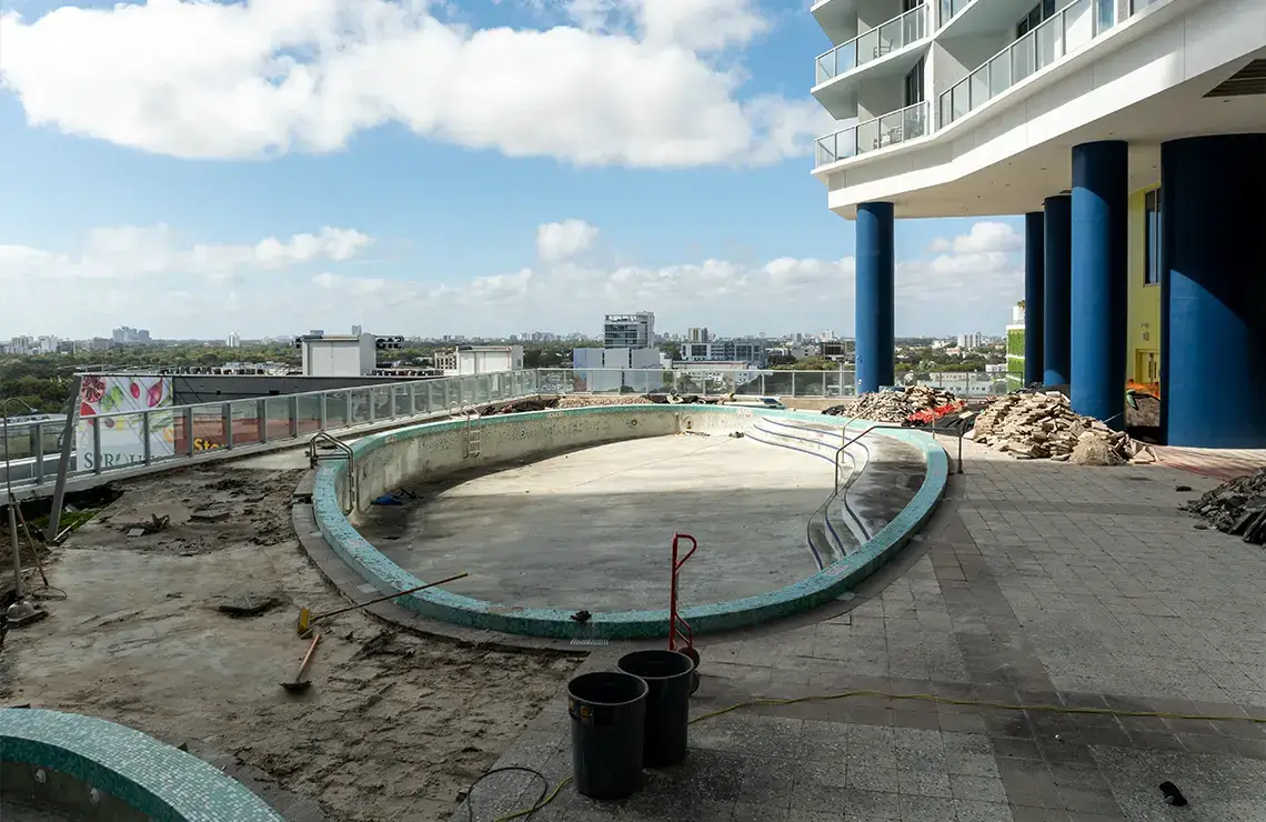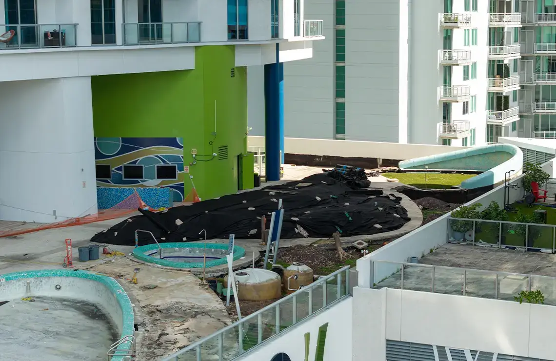 Key components involve waterproofing of all designated areas to ensure long-term water protection, utilizing Tremco VulkemĀ® EWS with advanced PUMA (Polyurethane-Methacrylate) technology for enhanced durability and fast-track application. The existing deck will be upgraded with the installation of new pavers, providing both aesthetic improvement and better surface drainage. The project includes a full resurfacing of the pool using Diamond Brite for a modern, durable finish, along with the installation of a completely new pool structure. The scope also includes refurbishment of the existing drainage system to improve efficiency and prevent water buildup. New planters will be installed to enhance the landscape design, and all waterproofing drains and topping slabs will be reinstalled to maintain structural integrity and ensure complete waterproofing protection. This project results in significant structural, functional, and visual improvements across the site.